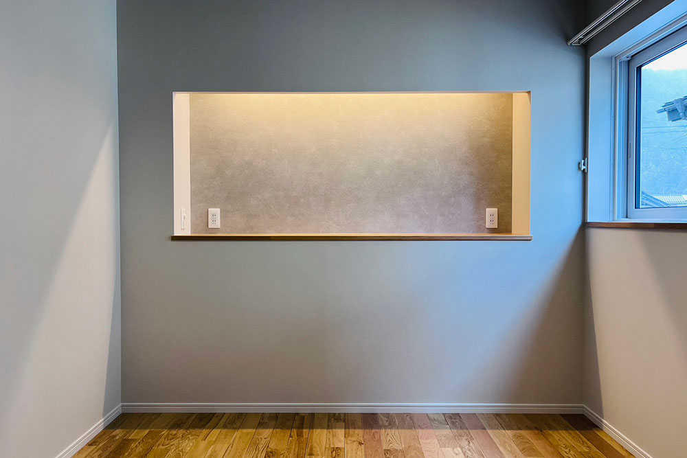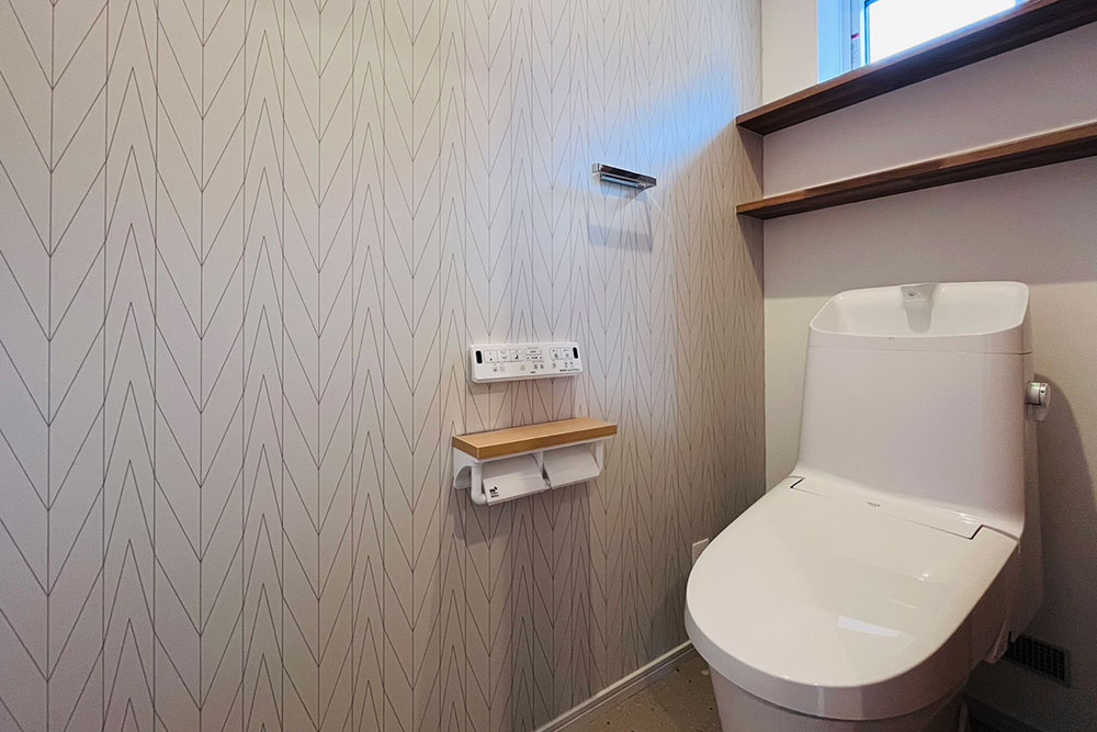 椹板の勾配天井と化粧梁がアクセントとなり、木の優しさを感じられるナチュラルな内装空間です。